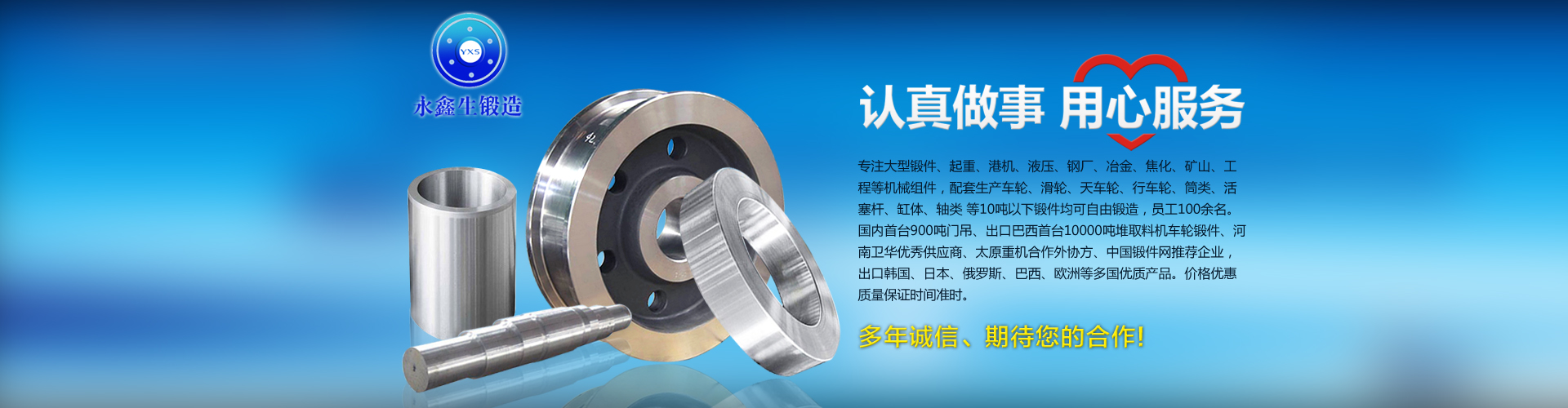 2000年公司注冊(cè),認(rèn)真做事,用心服務(wù),專注大型鍛件、起重機(jī)、港機(jī)、岸橋、液壓、火車、礦山、機(jī)車、挖掘機(jī)、工程等機(jī)械組件,配套生產(chǎn)車輪、滑輪、筒類、天車輪、活塞桿、行車輪、缸體、行車大輪、鏈輪、齒輪、槽輪、底座、中心支撐座、火車輪、軸類等 10噸以下鍛件均可自由鍛造,員工100余名。特色產(chǎn)品:鍛造車輪,專業(yè)車輪鍛件20余年,國(guó)內(nèi)企業(yè),起重機(jī)車輪的制造者。168鍛件網(wǎng)推薦企業(yè),價(jià)格優(yōu)惠質(zhì)量保證時(shí)間準(zhǔn)時(shí)。山西永鑫生是可按圖紙加工生產(chǎn)各類大型加工車輪淬火、成品。